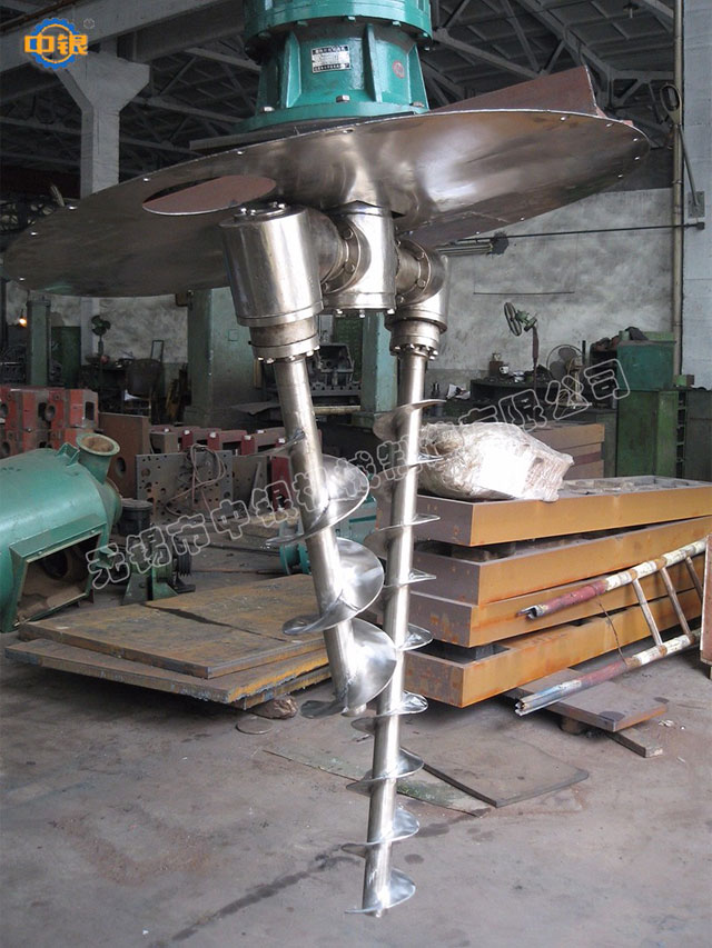 雙螺旋錐形混合機的攪拌部件為兩條不對稱懸臂螺旋,長短各一,它們在繞自己的軸線轉動(自轉)的同時,還環繞錐形容器的中心軸;借助轉臂的回轉在錐體壁面附近又作行星動(公轉);該設備通過螺旋的公、自轉使物料反復提升,在錐體內產生剪切、對流、擴散等復合運動,從而達到混合的目的。產品可根據要求設計外夾套(加熱、冷卻),噴霧器,廣泛應用于化工、醫藥、農藥、染料、建材等粉體與粉體的混合、反應。