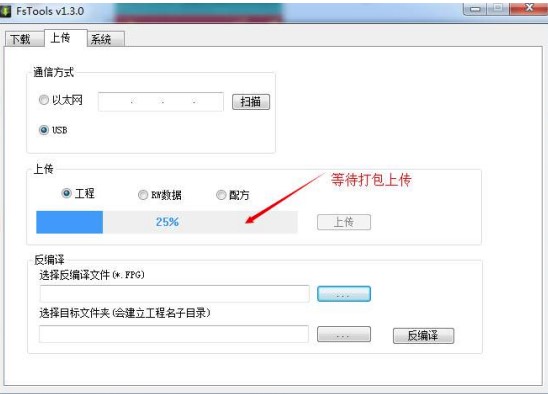 2. 軟件點擊”上傳“,設置通訊方式,選擇上傳工程,點擊上傳按鈕