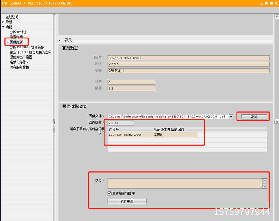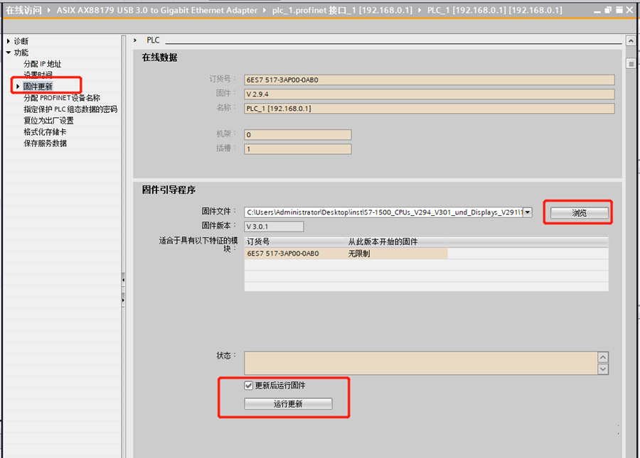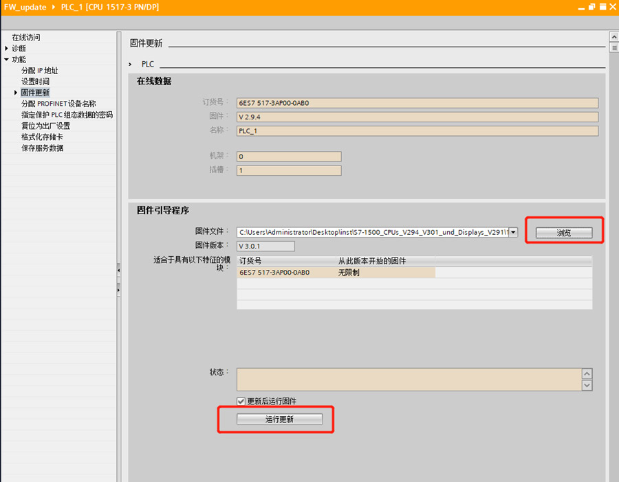 1. 先將CPU轉至在線,在線和診斷中點擊“功能”-“固件更新”,在PLC下選擇固件文件,運行更新