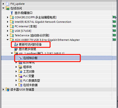 1. 連接PLC后,在博途項目樹中展開“在線訪問”,搜索到需要更新的設備,進入“在線和診斷”